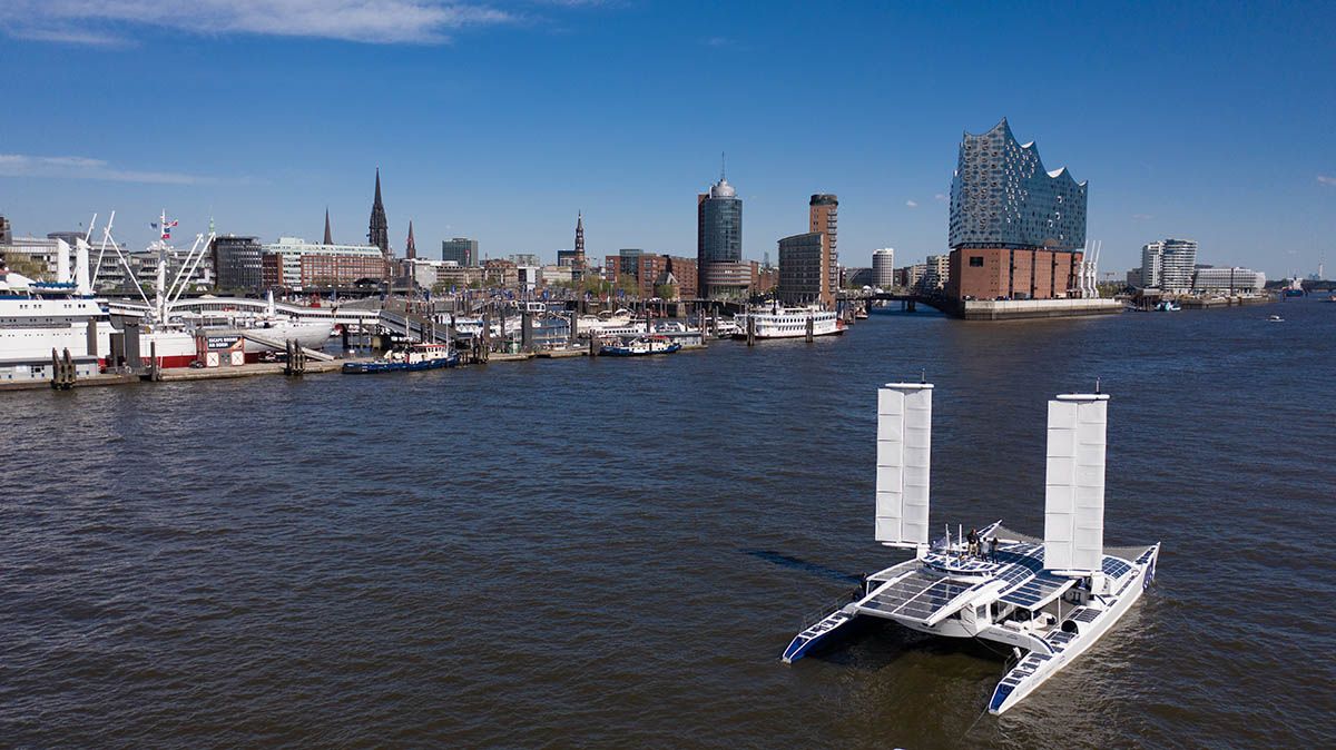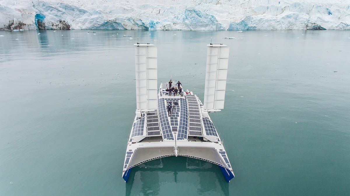 Der Mix, mit dem der Katamaran angetrieben wird, sieht so aus: Mehr als 200 Quadratmeter Solarzellen auf der Oberfläche des Boots fangen die Sonnenstrahlen ein, auch die vom Wasser reflektierten. Zwei Hightech-Segel richten sich selbstständig aus, um die maximale Menge Wind aufzunehmen – und dabei sogar noch Strom zu erzeugen. Auch die Schiffsschraube läuft – während der Katamaran segelt – passiv weiter und erzeugt so Strom.