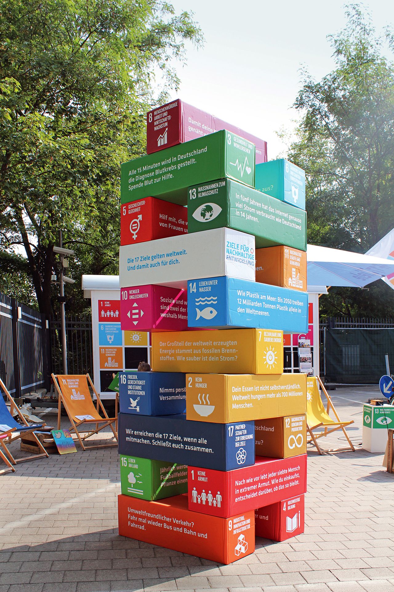 Wo immer das farbenfrohe 17-Ziele-Mobil auftaucht: Es ist ein Hingucker und weckt Neugier. Ob beim Haldern Pop Festival, bei Lollapalooza oder auf der Fanmeile der Leichtathletik-Europameisterschaft in Berlin: Die Menschen schauen vorbei, kommen ins Gespräch, probieren einfach mal aus, mit einem Fahrrad zur Energiegewinnung ihr Handy aufzuladen, oder stapeln riesige Jenga-Würfel im 17-Ziele-Look – auch, um zu erkennen, wie die einzelnen Ziele zueinander stehen. Immer wieder beeindruckt sind Jung und Alt vom 3-D-Erlebnis, bei dem virtuelle Brillen sie mitten in ein Flüchtlingscamp in Jordanien versetzen.